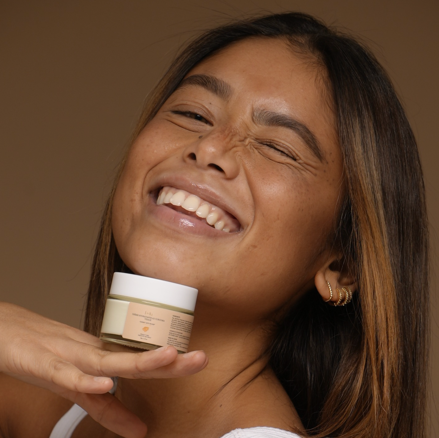 La crème au curcuma de chez Jadia© aide à diminuer les taches sombres et à unifier le teint grâce à ses puissantes propriétés anti-inflammatoires et antioxydantes. Elle augmente également l'éclat de la peau et contribue à la cicatrisation des cicatrices d'acné.