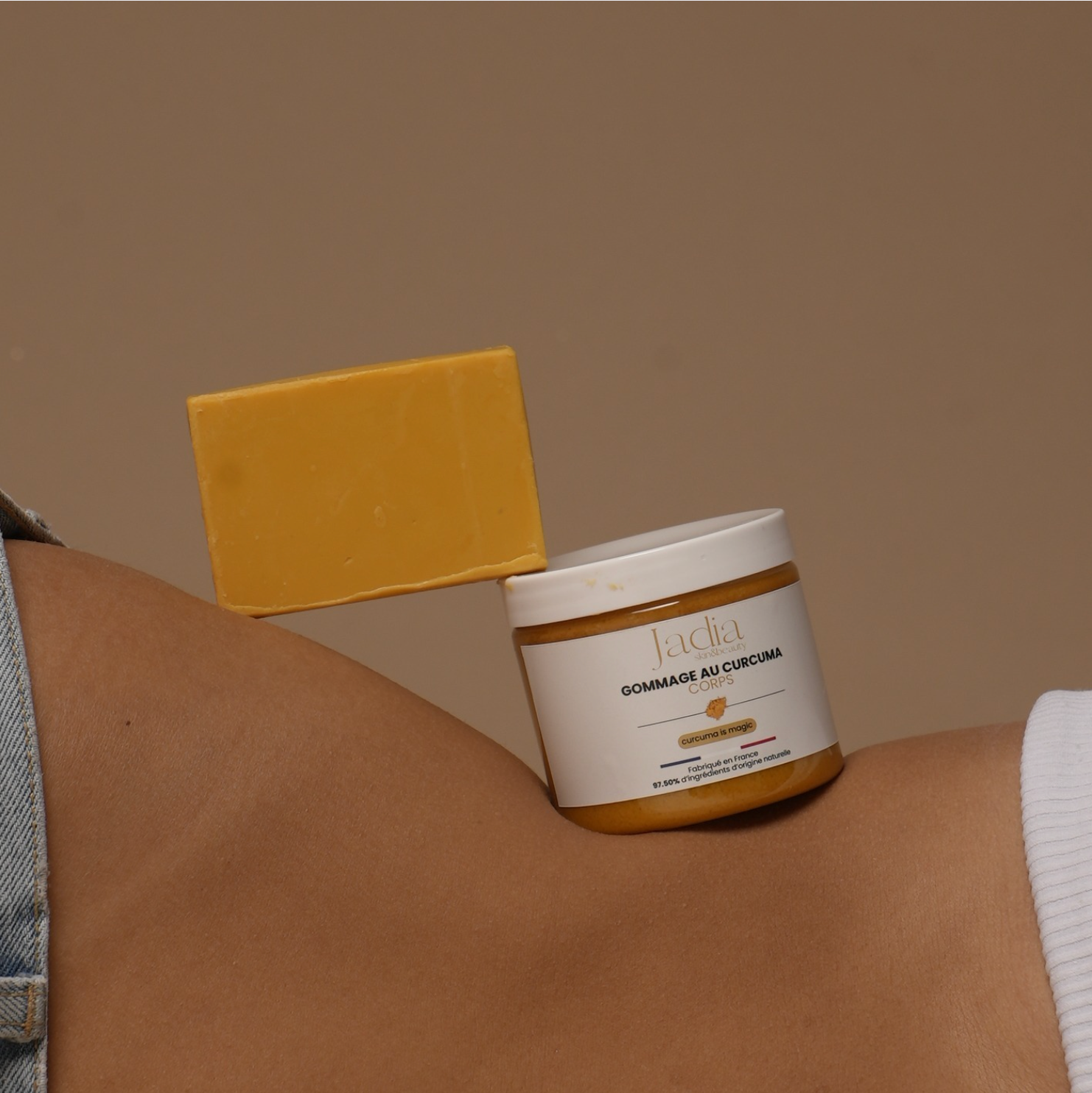 Notre savon au curcuma Jadia© aide à améliorer l'éclat de la peau et à uniformiser le teint grâce à ses propriétés antioxydantes et anti-inflammatoires. Il contribue également à réduire l'apparence des cicatrices et des inflammations, laissant la peau plus lisse et visiblement plus saine.
